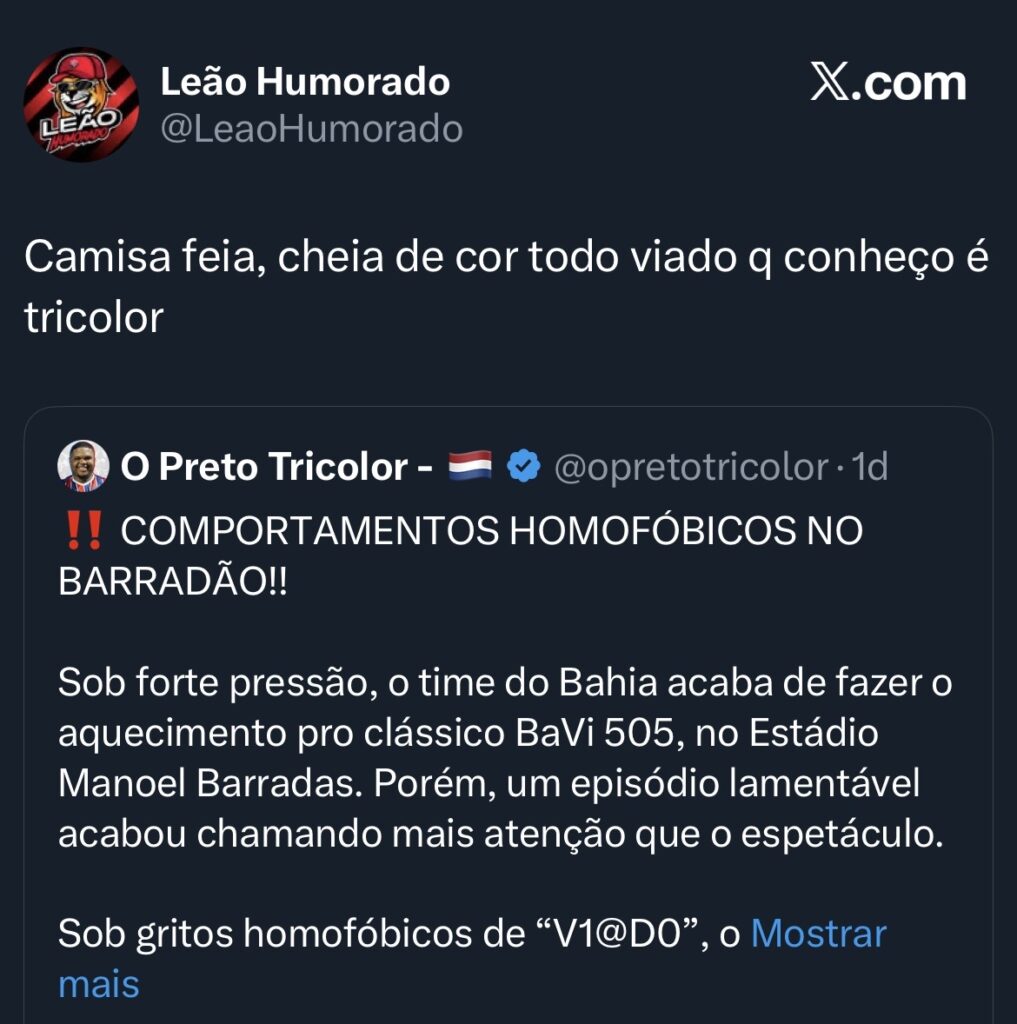 O episódio não se limitou ao estádio. A página “Leão Humorado”, em vez de repudiar a conduta, compartilhou o vídeo do momento em suas redes sociais. A postura da página foi uma incitação direta à homofobia.
