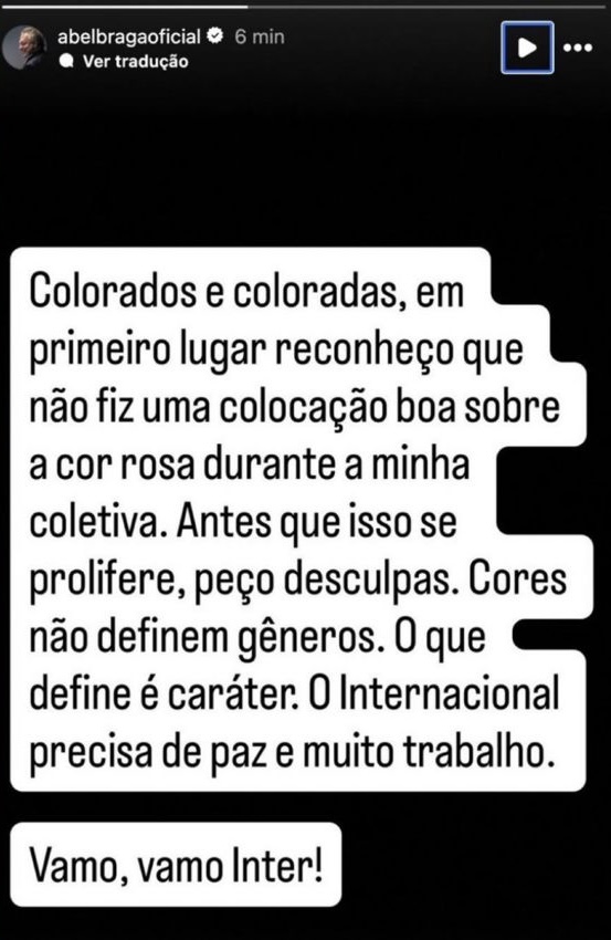 Após a enorme repercussão de sua declaração homofóbica na primeira entrevista coletiva no comando do Internacional, o técnico Abel Braga utilizou as redes sociais para se desculpar publicamente. Em um story na plataforma Instagram, o treinador admitiu o erro e reconheceu que sua colocação sobre a cor rosa dos uniformes de treino foi inadequada.